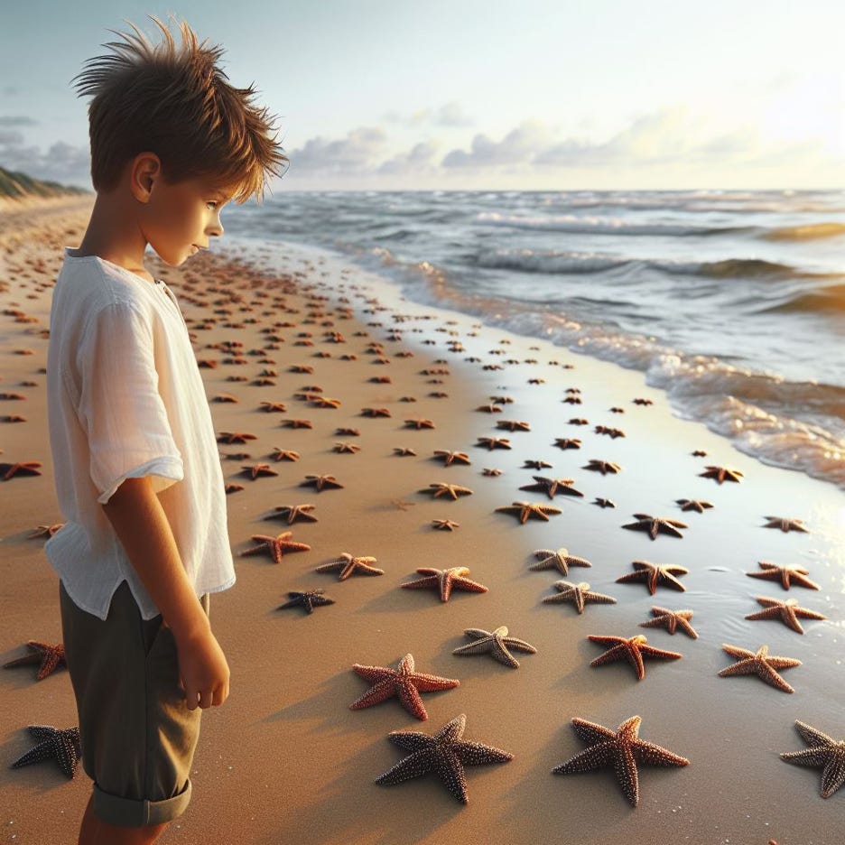 There was a stir within. Something came over the boy, something he couldn't quite explain–a rush of adrenaline, a sense of obligation, a burden too heavy to be ignored. Though he had no tractor or shovel, he used what he had. He ran as fast as his little legs could take him. He picked up one starfish at a time and began to toss them into the ocean. He was filled with a fervor that could not be explained. He threw and threw one beautiful starfish after another. The job seemed impossible, but he knew he had to do something.